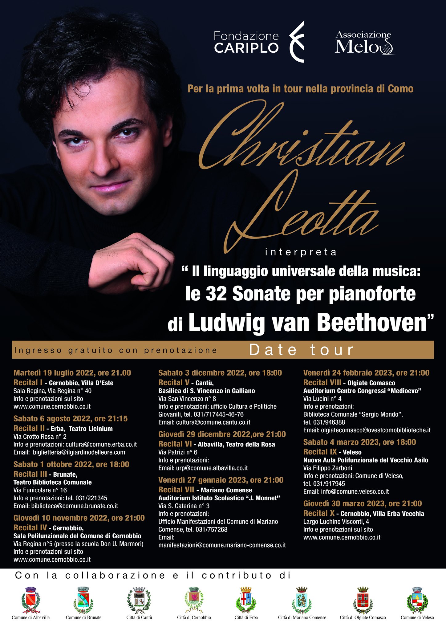 Una tournée di dieci concerti di questi tempi ha dello straordinario. Se poi in programma c’è l’integrale delle 32 Sonate per pianoforte di Beethoven la gioia è ancora più grande. Ma la magia è completa quando a tutto ciò aggiungiamo il territorio, quello meraviglioso della provincia di Como, che assieme al lago più bello e famoso del mondo ha così tanto da offrire. Lo dice e lo pensa su Facebook il pianista comasco Christian Leotta protagonista di una intensa tournee Beethoveniana estiva. "Un sincero ringraziamento a Fondazione Cariplo, a Fondazione Comasca, ai Sindaci dei Comuni di Albavilla, Giuliana Castelnuovo, di Brunate, Valerio Saffioti, di Cantù, Alice Galbiati, di Cernobbio, Matteo Monti, di Erba, Veronica Airoldi e Mauro Caprani, di Mariano Comense, Giovanni Alberti, di Olgiate Comasco, Simone Moretti, di Veleso, Livia Cioffi, a Villa D’Este e a Villa Erba a Cernobbio, e all’Associazione Melos, per aver reso questo sogno realtà.